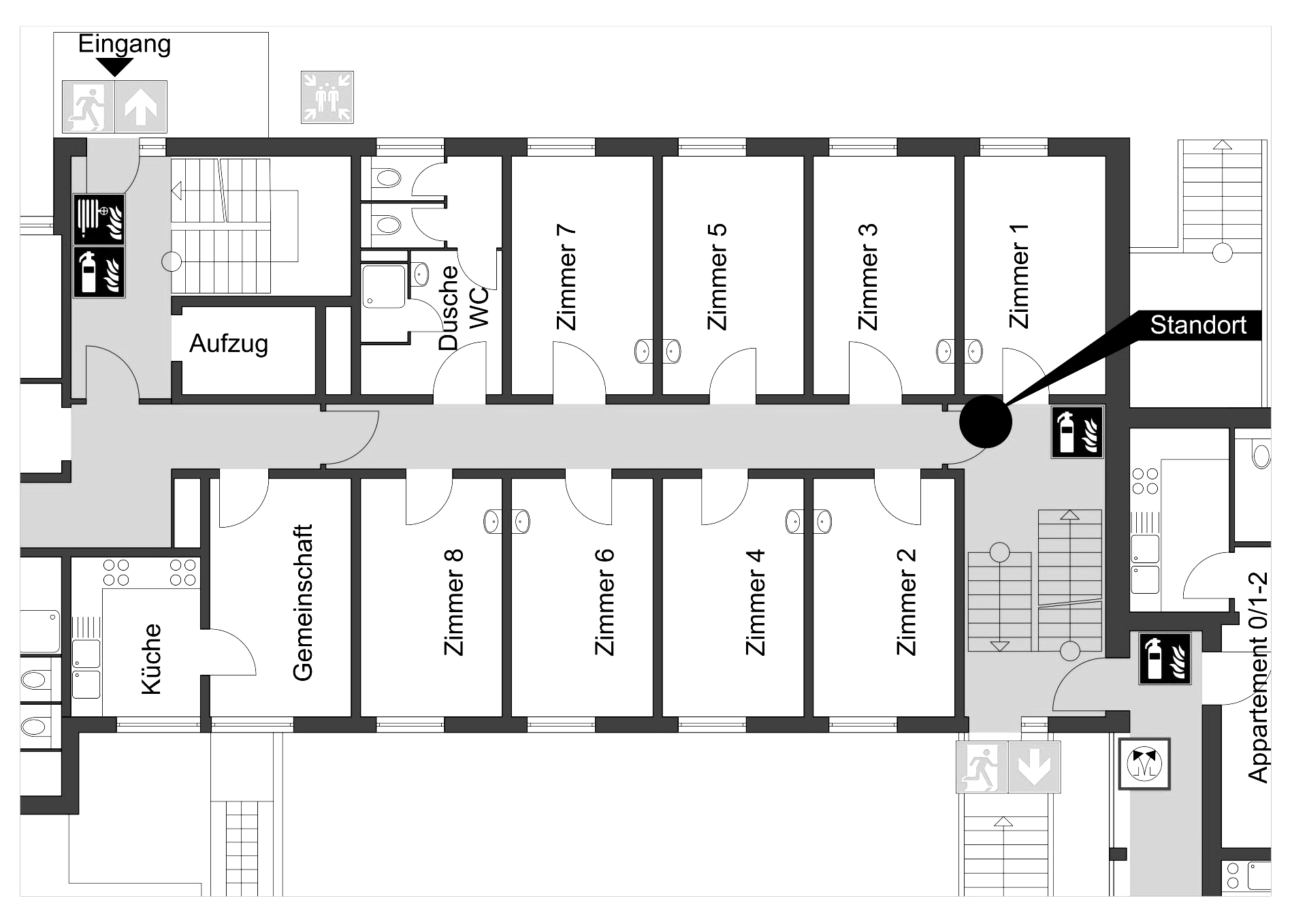 - Wo sind Standorte der Alarmierungssysteme und Brandbekämpfungseinrichtungen?
